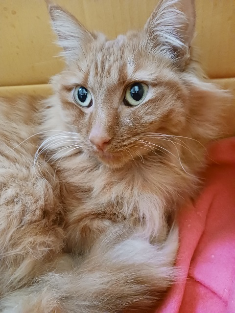 長毛がとても綺麗な茶トラの女の子です。撫でられますが、あまりしつこいとプイッと離れていきます。まだ抱っこはできないので、病院等はネットに入れて行くなどの配慮が必要です。手からちゅーるも食べてくれます。