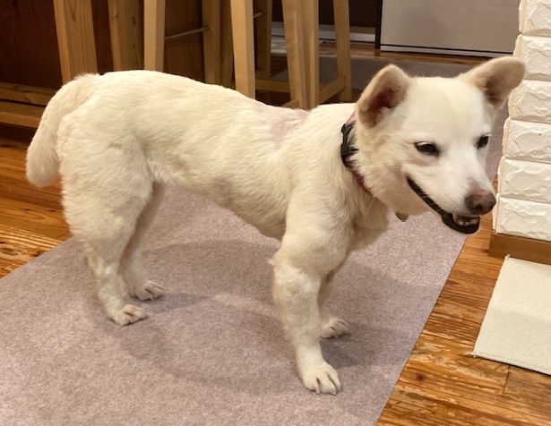 不妊手術時に乳腺腫瘍切除(良性)、鼠径ヘルニア整復、左肩背部腫瘤切除(良性)、上下臼歯3本を抜歯しました。また、首周りなど、被毛や皮膚の状態が良くない部分があるので、シャンプーなどのケアが必要です。