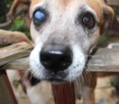 白濁した右目は、手をかざすと影が見える程度の視力はあるようです。見えにくいことでの不便は全くないようで、動きも機敏で何かにぶつかるということもありません。