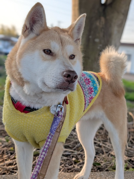 散歩は好きでよく歩きます。まだ少し引きがあるので、人のペースに合わせて歩けるよう練習中です。猫や鳥が素早く動くと急に追いかけるので、逸走には注意が必要です。散歩中は他犬に会っても上手に挨拶出来ます。車酔いはありません。