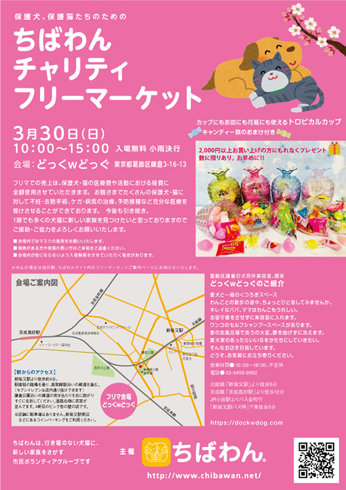 3月30日(日)に葛飾区ドッグカフェ”どっくwどっぐ”にてチャリティフリマを開催することになりました!いぬ親会会場としても利用させて頂いております”どっくwどっぐ”でのチャリティフリマです。 チャリティグッズや全国の皆様がご寄付して下さったフリマ物資を販売させて頂きます! フリマでの売上は、医療費や活動における経費に全額使用させていただいております。おかげさまでたくさんの保護犬・猫に対して不妊去勢手術、怪我や病気の治療、予防接種など、十分な医療を受けさせることができております。今後も引き続き、1頭でも多くの犬猫に新しい家族を見つけたいと思っておりますので、ご援助・ご協力をよろしくお願いいたします。 是非ご家族、お友達と一緒に遊びに来て下さい。思わぬ掘り出し物が見つかるかもしれません!