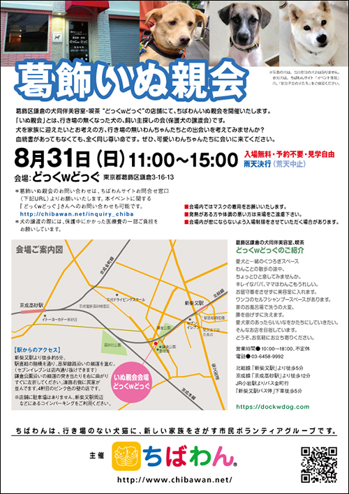 葛飾区鎌倉のいぬ同伴美容室・喫茶“どっくwどっぐ”の店舗にていぬ親会を開催します。 【ちばわんからのお願い】 会場内ではマスクの着用をお願いします。 発熱がある方や体調が悪い方は来場をご遠慮ください。 会場内が密にならないよう入場制限をさせていただく場合があります。 |