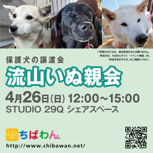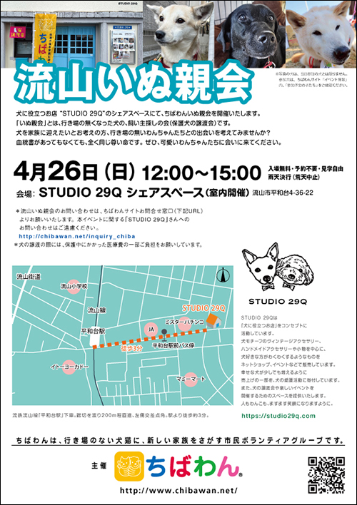 “STUDIO 29Q”にて第35回 流山いぬ親会を開催いたします。 飼い主探しをしている保護犬達に会いにきてみませんか。