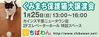 カインズ千葉ニュータウン店にて開催される千葉県動物愛護センター主催の譲渡会「くみまち保護猫大譲渡会」に、ちばわんも参加いたします。