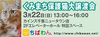 カインズ千葉ニュータウン店にて開催される千葉県動物愛護センター主催の譲渡会「くみまち保護猫大譲渡会」に、ちばわんも参加いたします。
