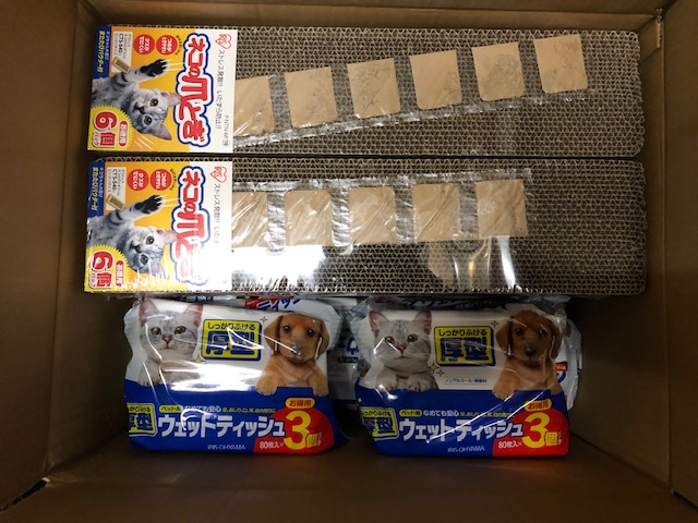 愛知県岡崎市の FK より、爪とぎ、フード、トイレシート、ウエットティッシュをいただきました。